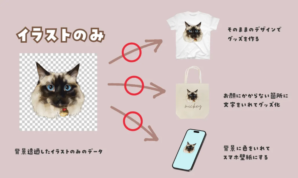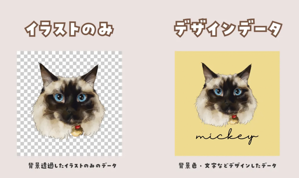 イラストのみでご希望の場合は、イラストのみ背景透過したデータでお渡し、デザインしたデータでご希望の場合は、背景色のあるデザインデータでお渡しいたします