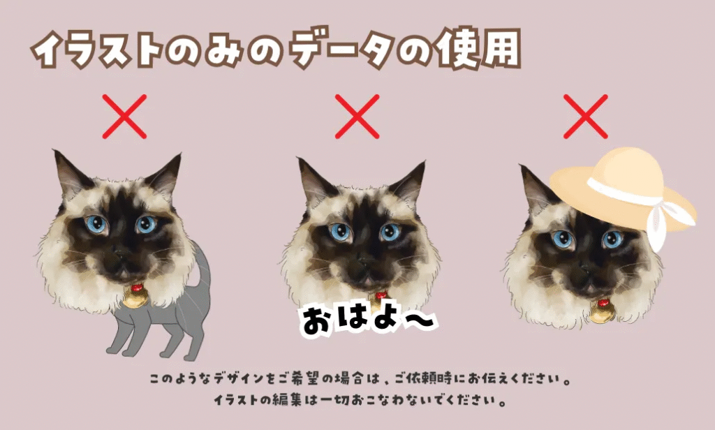 デザインデータでのお渡しの場合は、背景透過や背景色を変える、イラストの一部のみを使うなどの一切の編集をせず、そのままの状態でのみご使用ください。